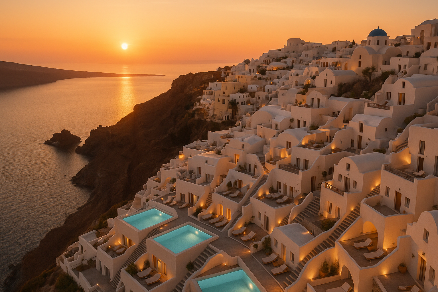 A luxury stay in Santorini overlooking the Aegean, with sunset view, infinity pool access, and breakfast included.